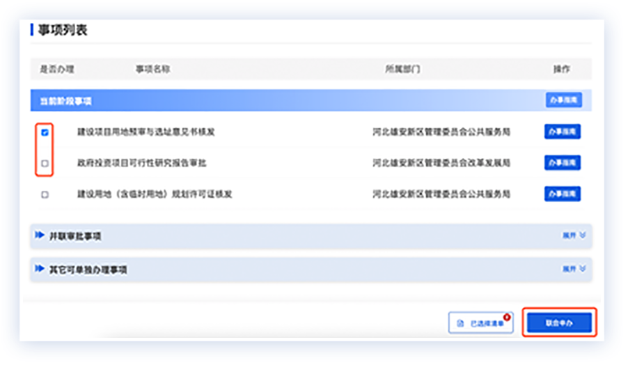 根据实际情况选择对应的投资方式、立项方式、项目类别、 项目阶段,勾选所申报的事项信息,点击网页下方的联合申办。
